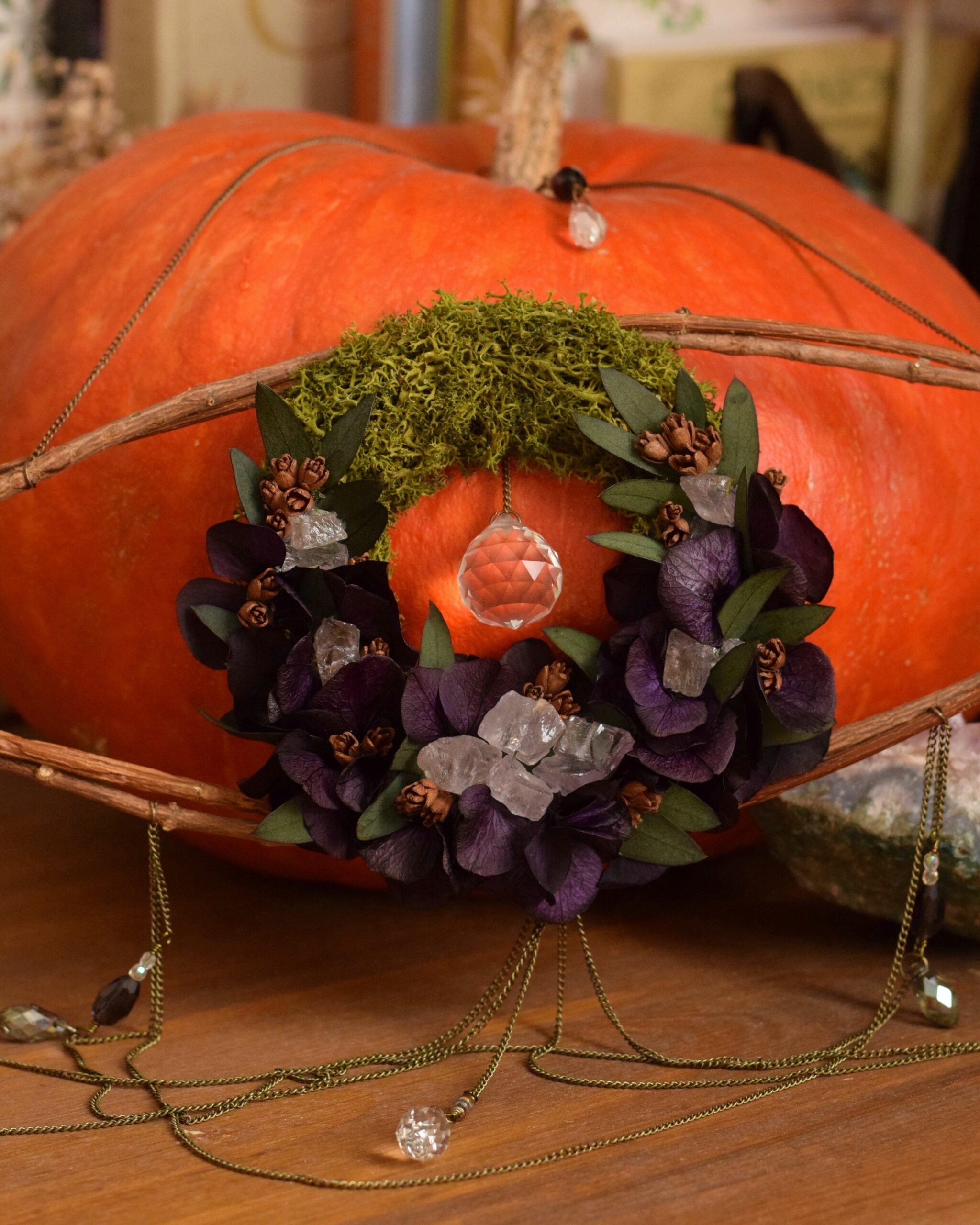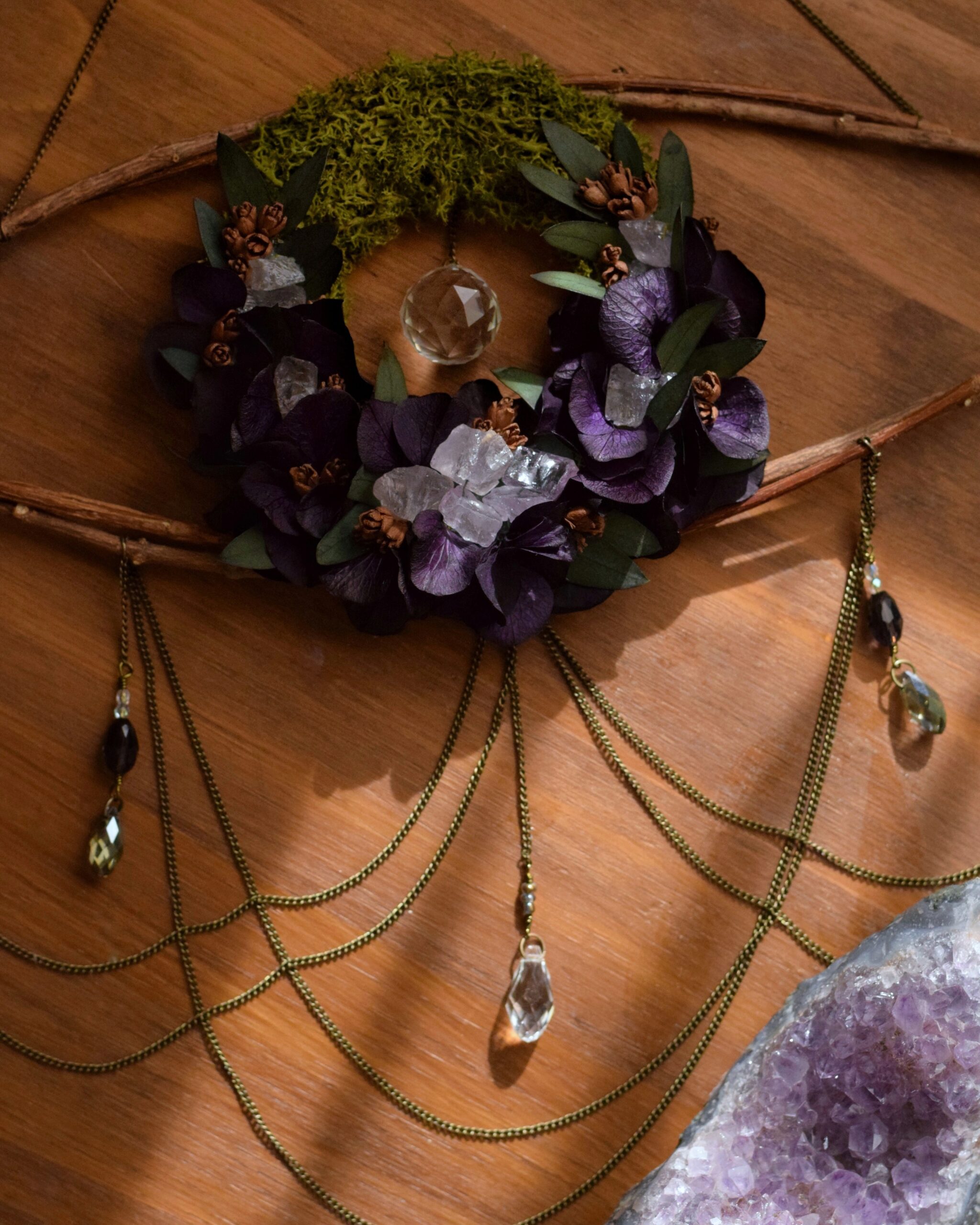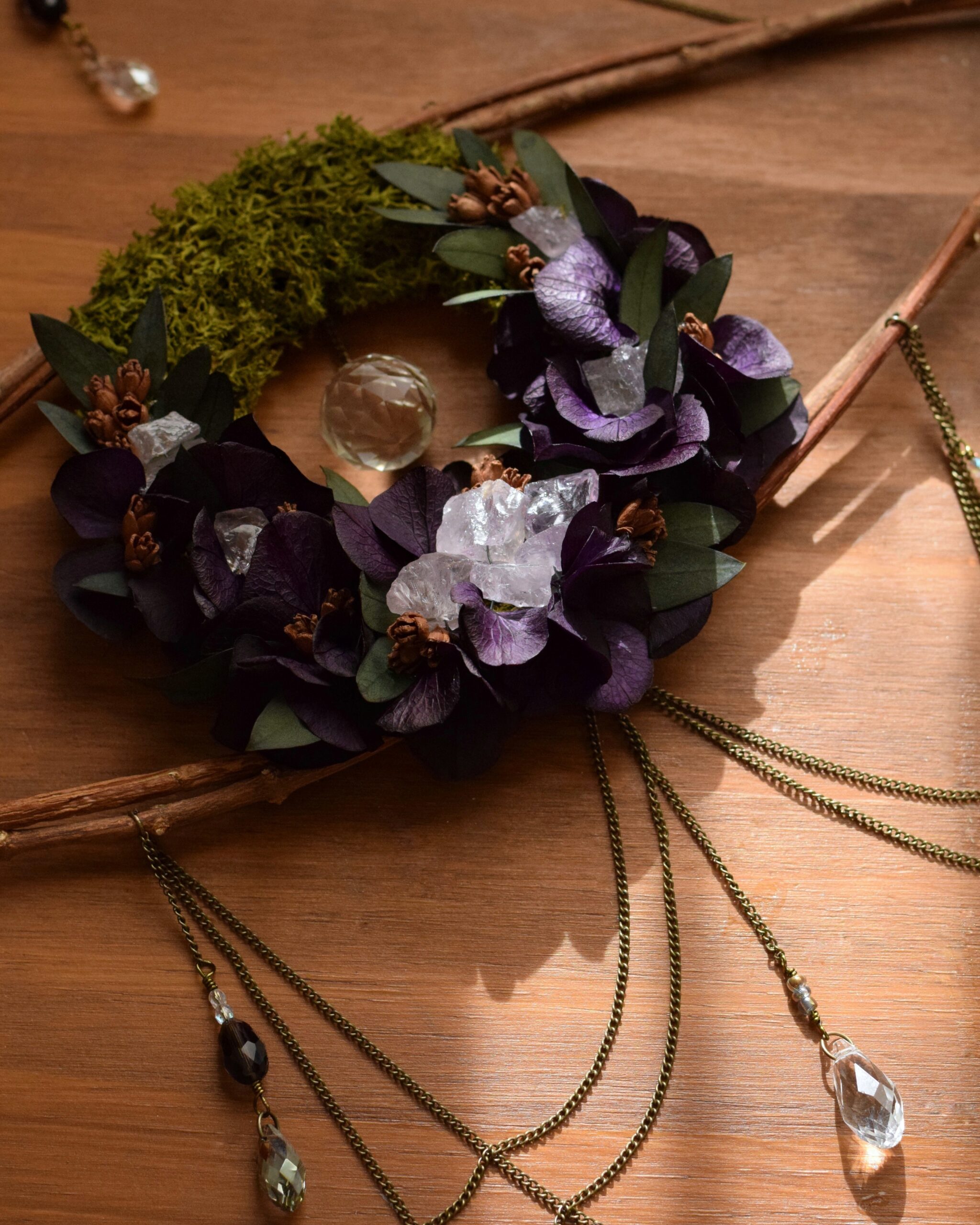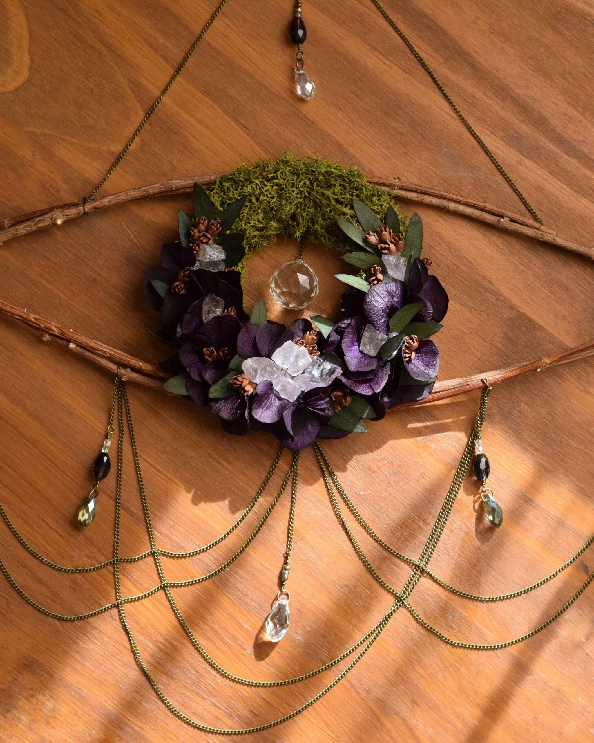Ametalia est une couronne de fleurs séchées et stabilisées en forme d’œil appelée Maka Eye. Avec ses pierres d’améthystes disposées sur la couronne, et ses plantes violettes et vertes foncées, cette création a un look très witchy.