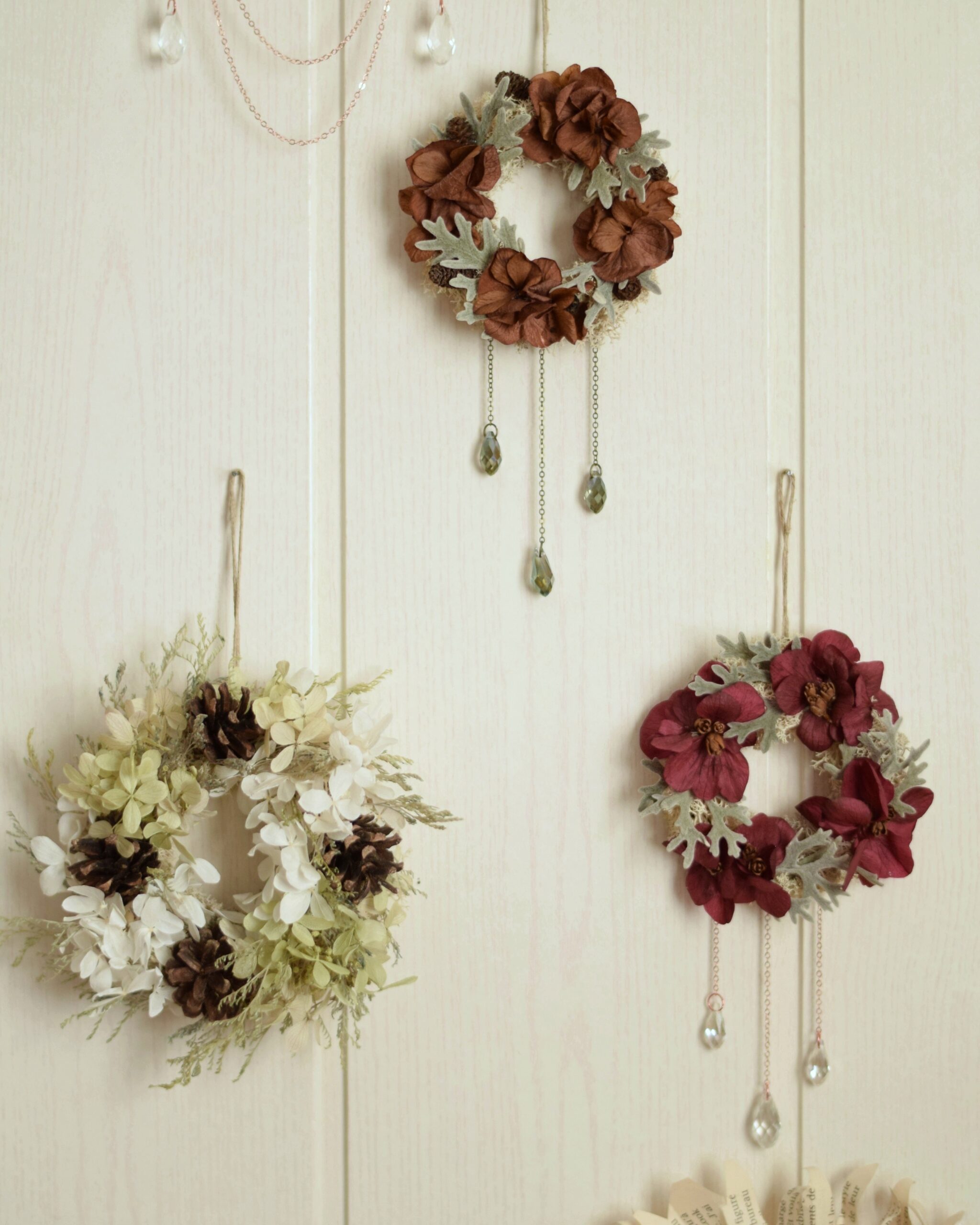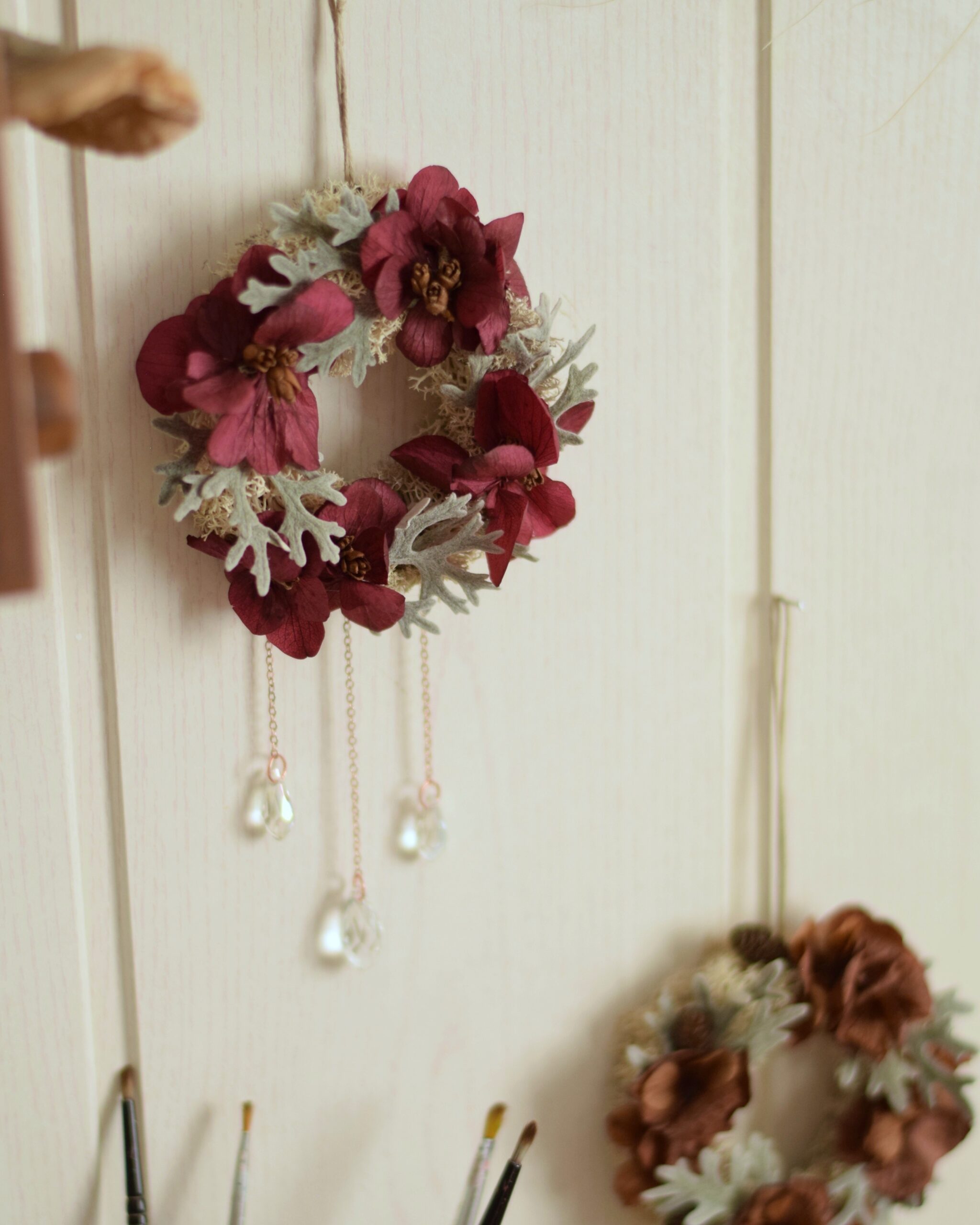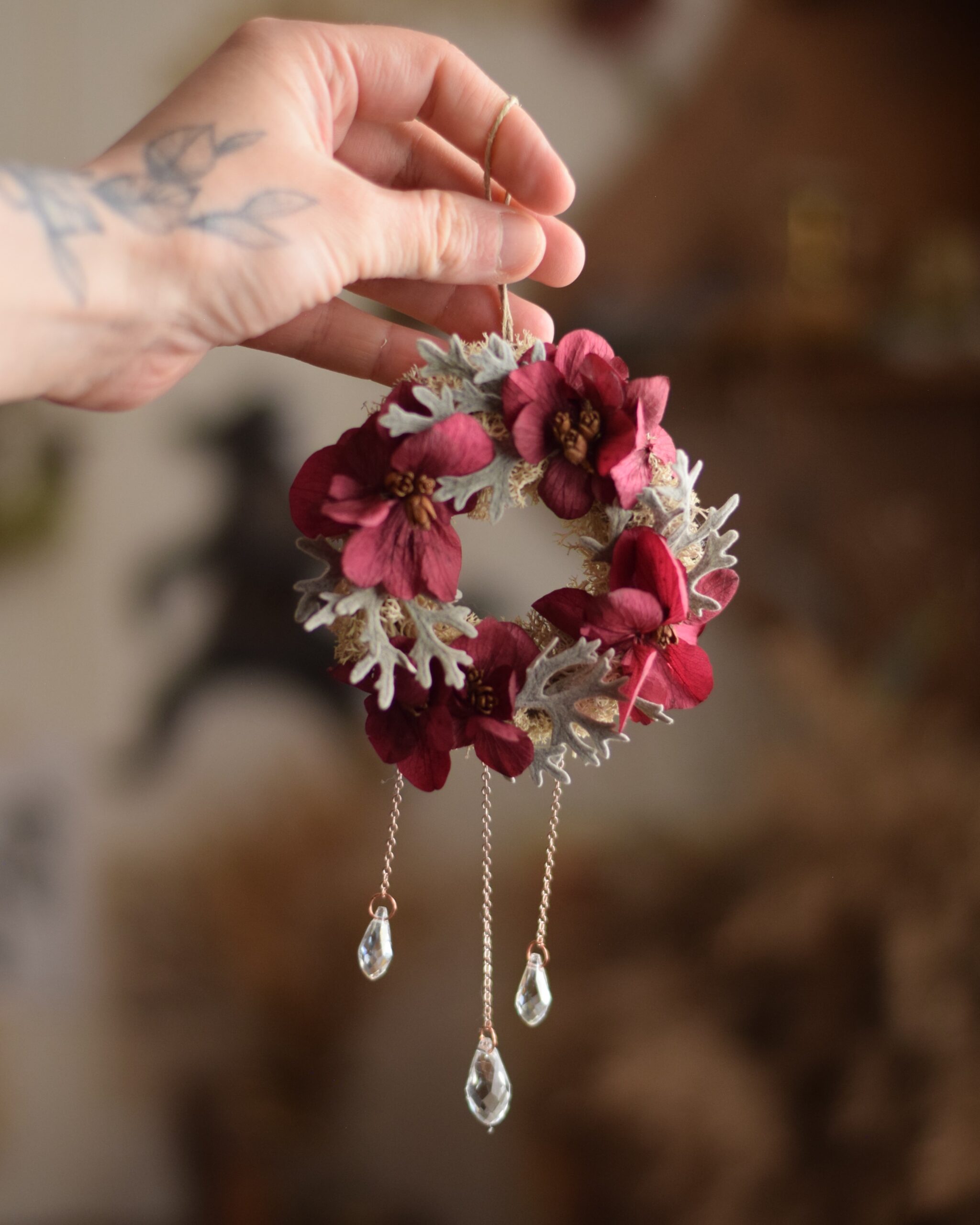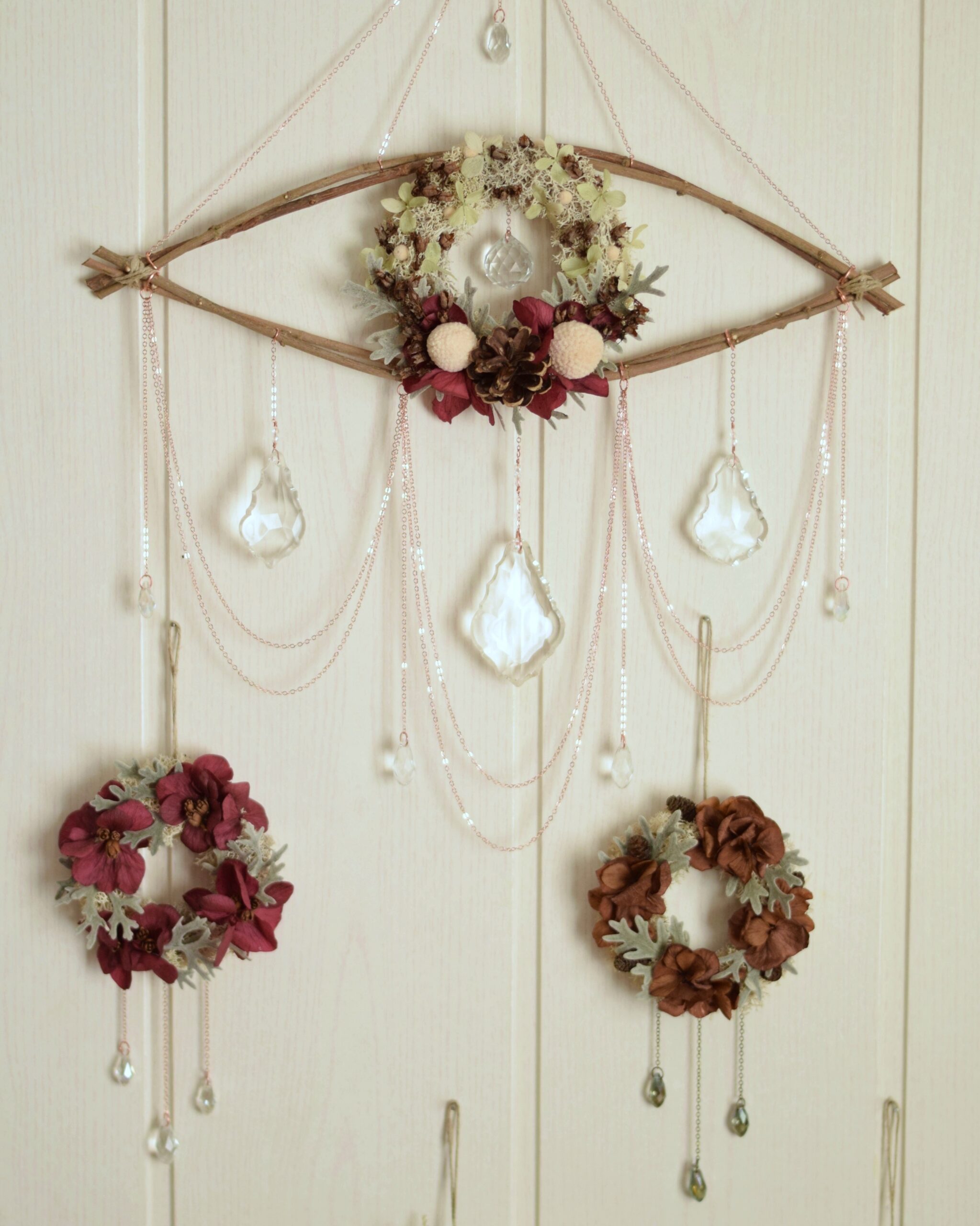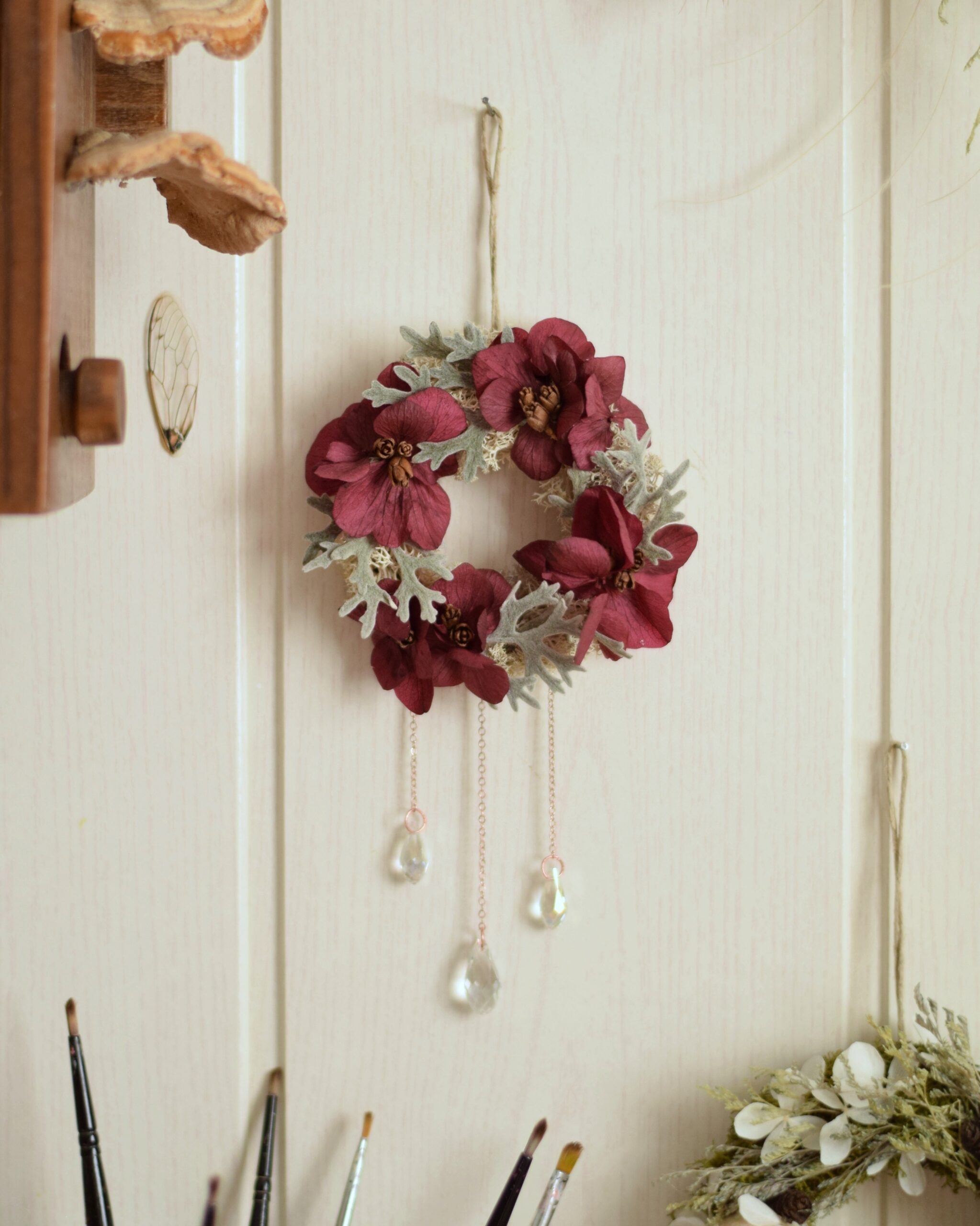 Ce Mikro est fait à partir d’un anneau de rideau en bois sur lequel j’ai collé de véritables fleurs séchées et stabilisées. Enfin, j’ai accroché de fines chaînes ainsi que 3 perles en cristal AB qui font scintiller la création et font d’elle un véritable bijou de mur.