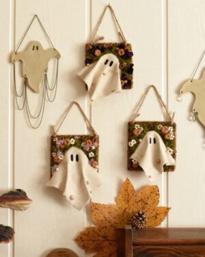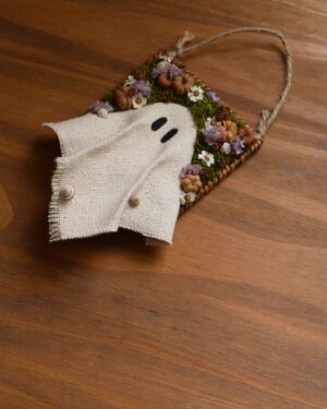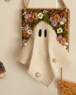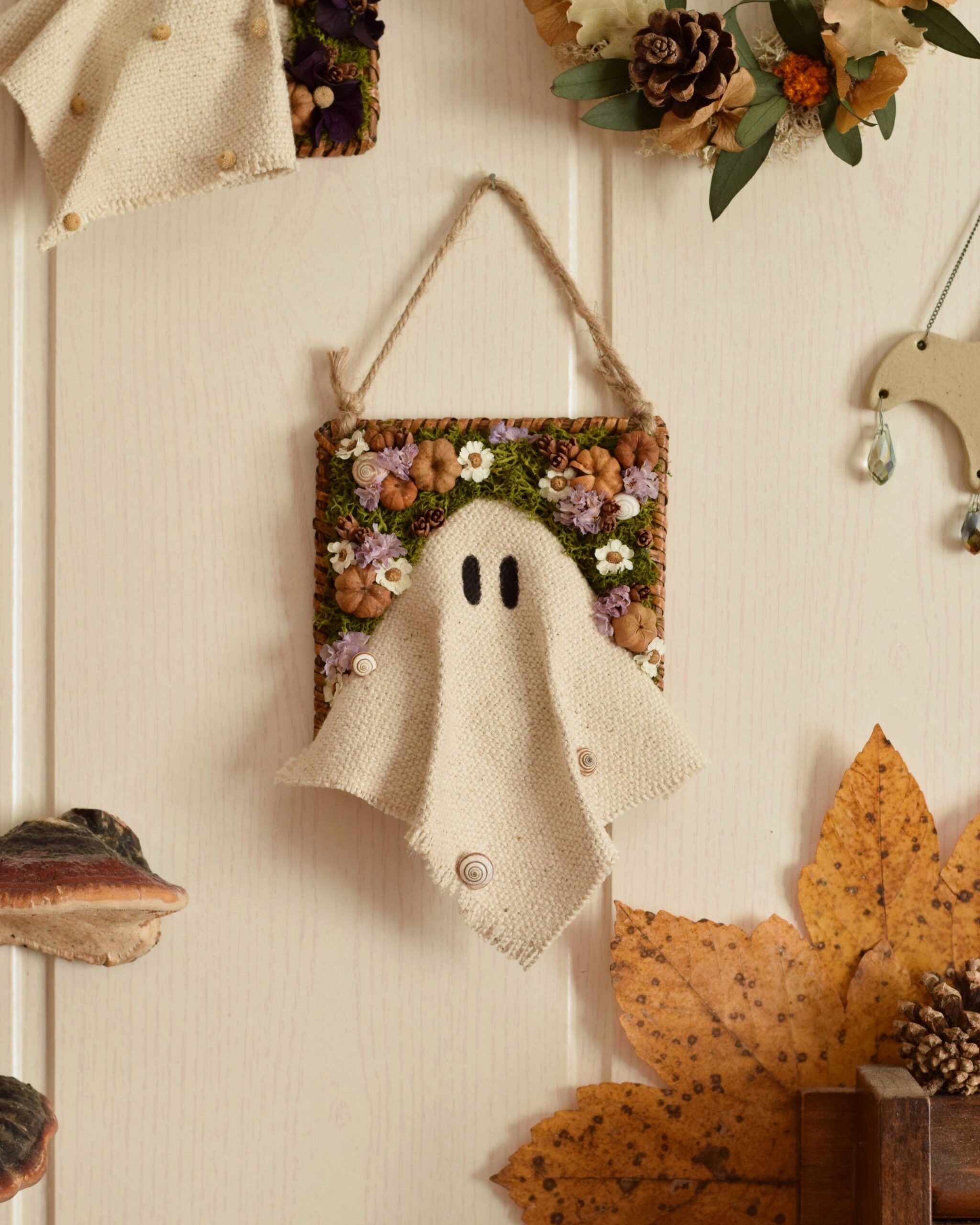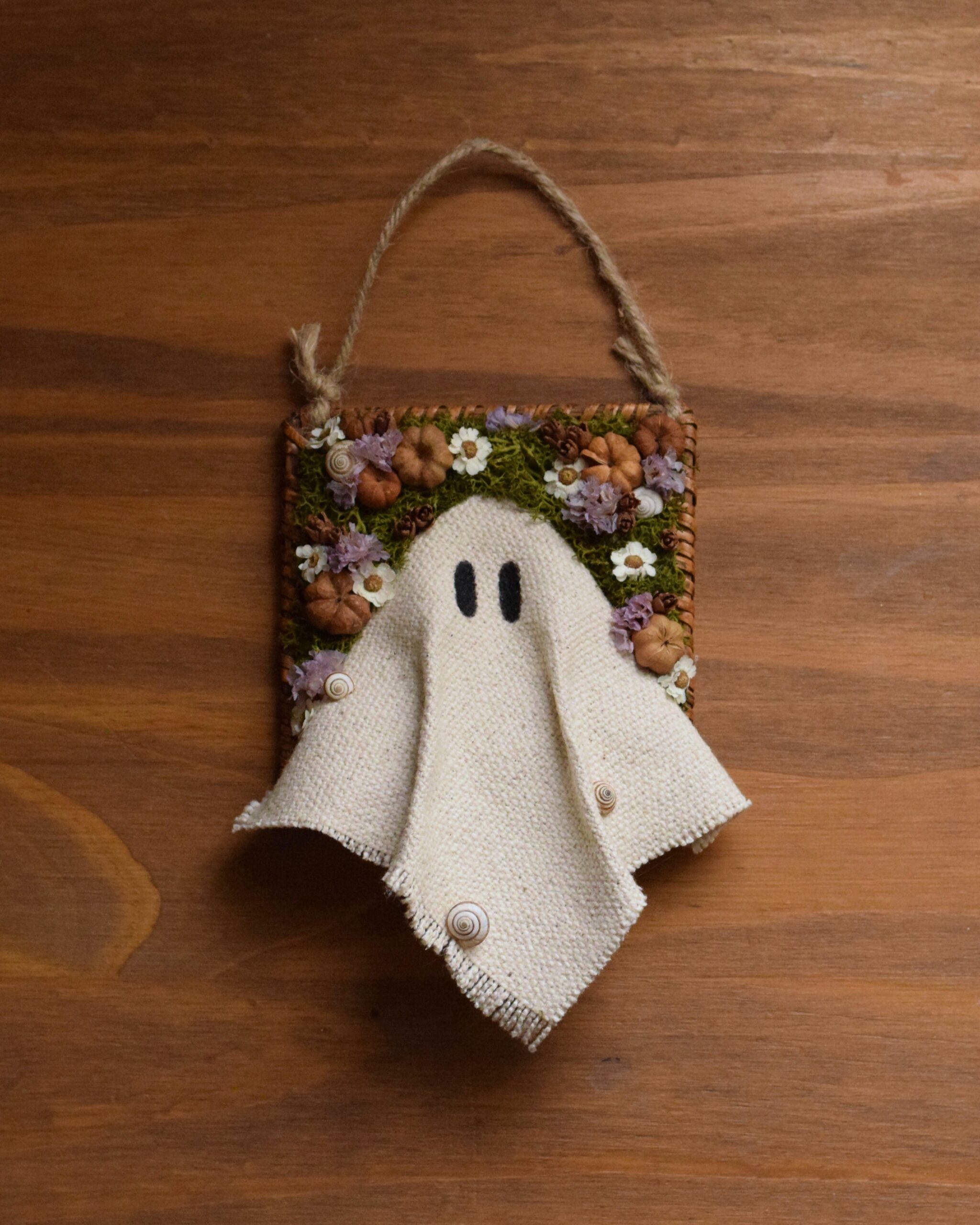Cette petite suspension automnale et spooky est composée d’un fantôme en tissu, de véritables fleurs séchées, de lichen stabilisé, et de minies coquilles d’escargots que j’ai glanées dans la nature qui m’entoure.