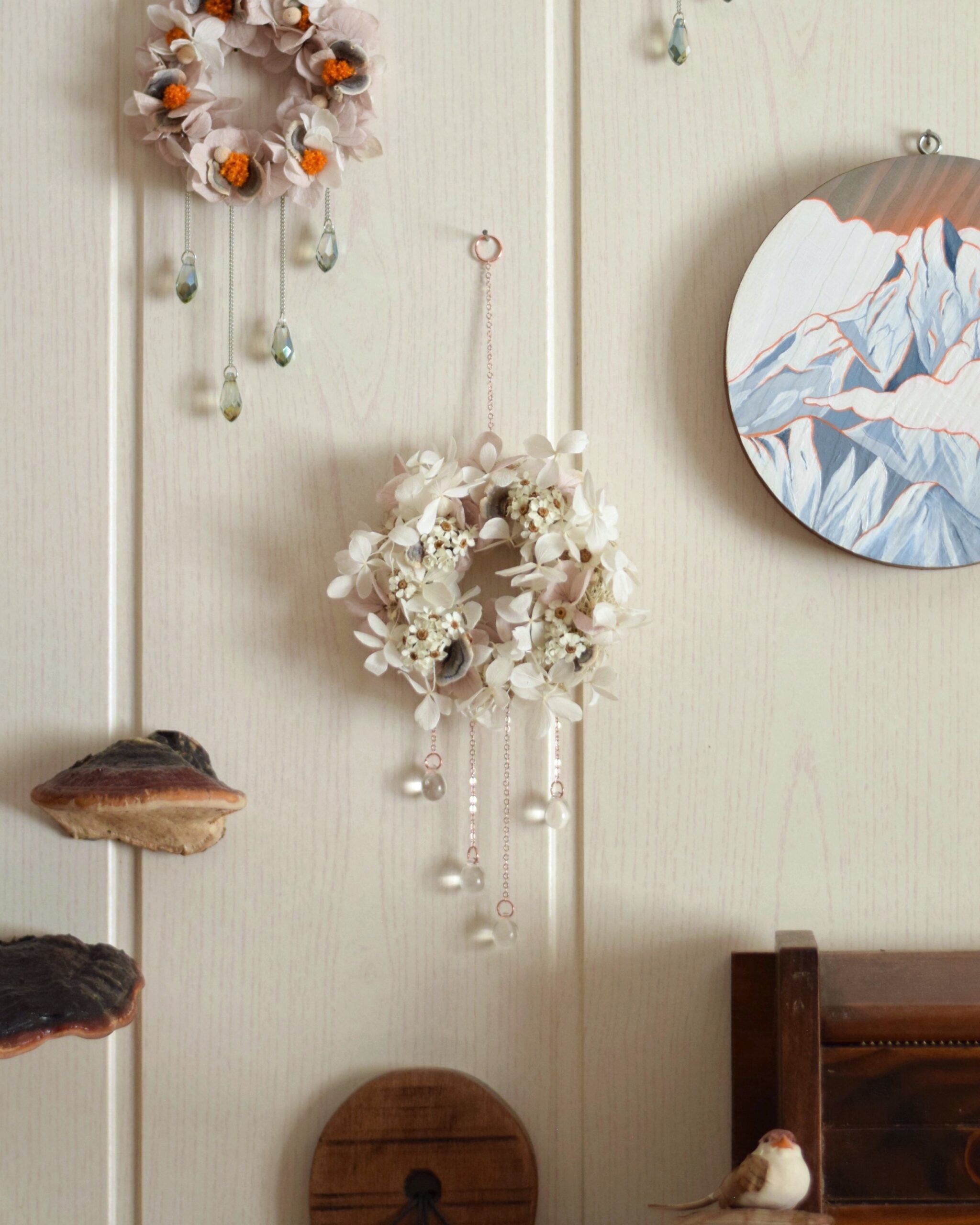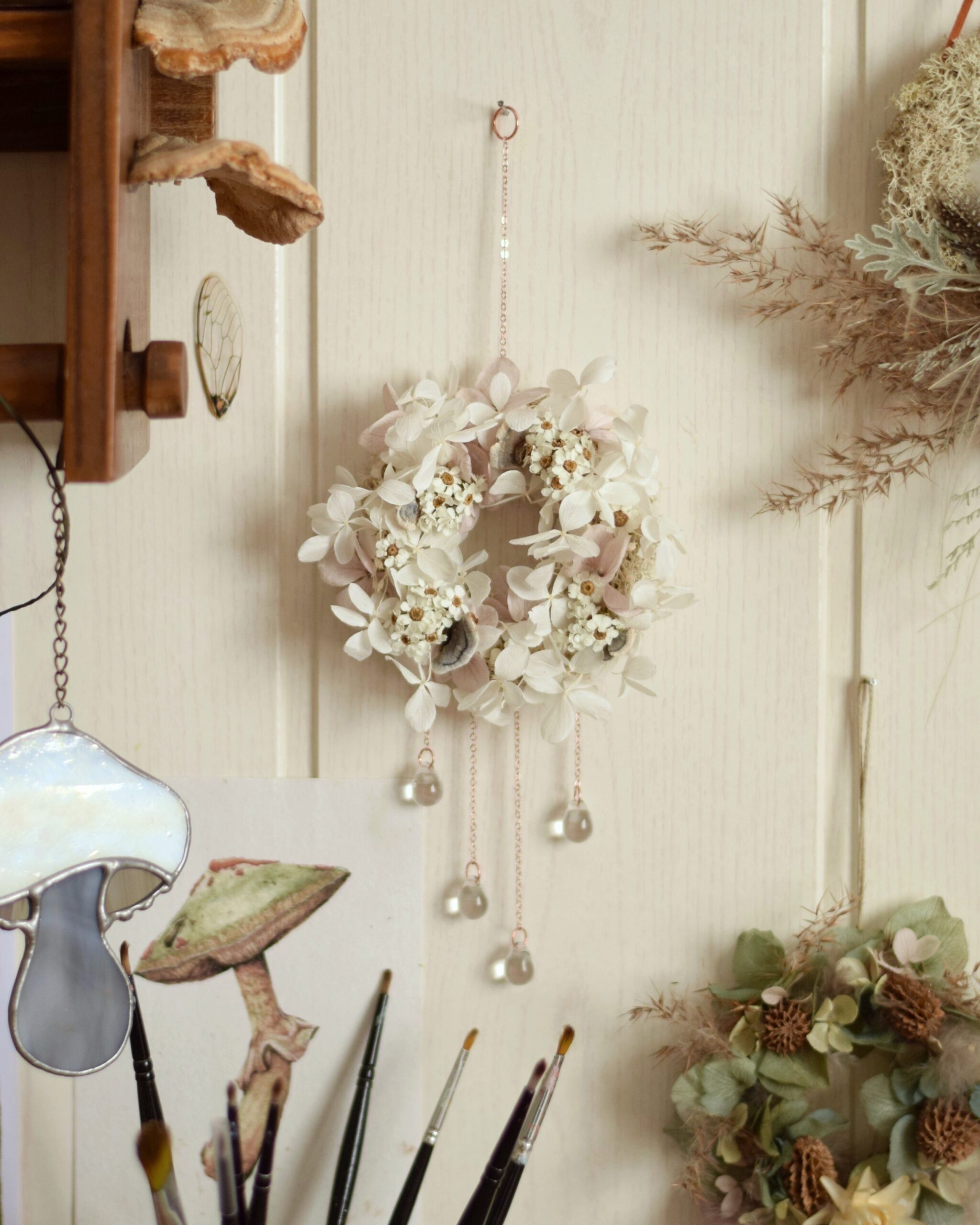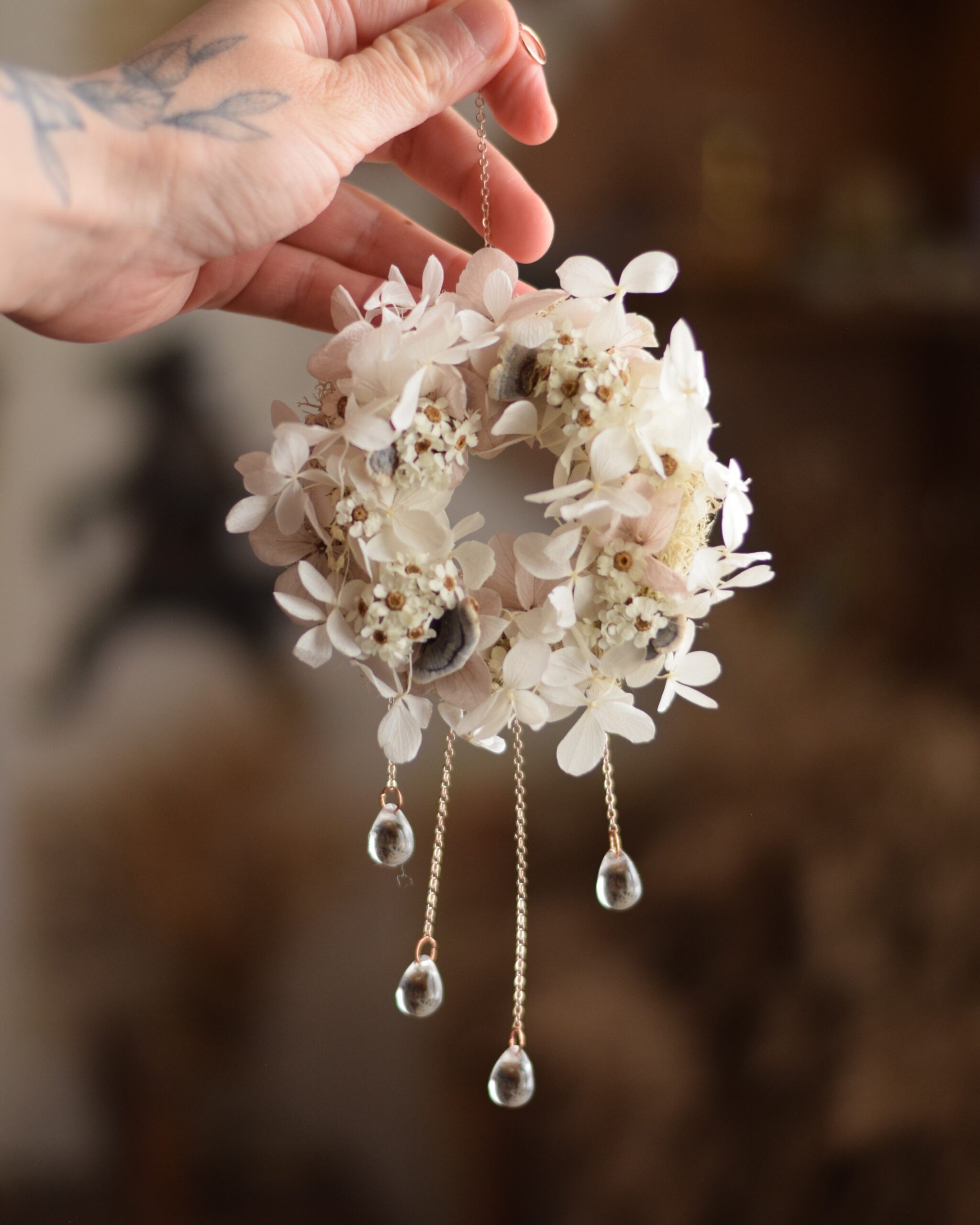 Ce Mikro est fait à partir d’un anneau de rideau en bois sur lequel j’ai collé de véritables fleurs séchées et stabilisées ainsi que quelques champignons séchés. Enfin, j’ai accroché de fines chaînes ainsi que 4 perles de verre en forme de gouttes d’eau qui font scintiller la création et font d’elle un véritable bijou de mur féérique.