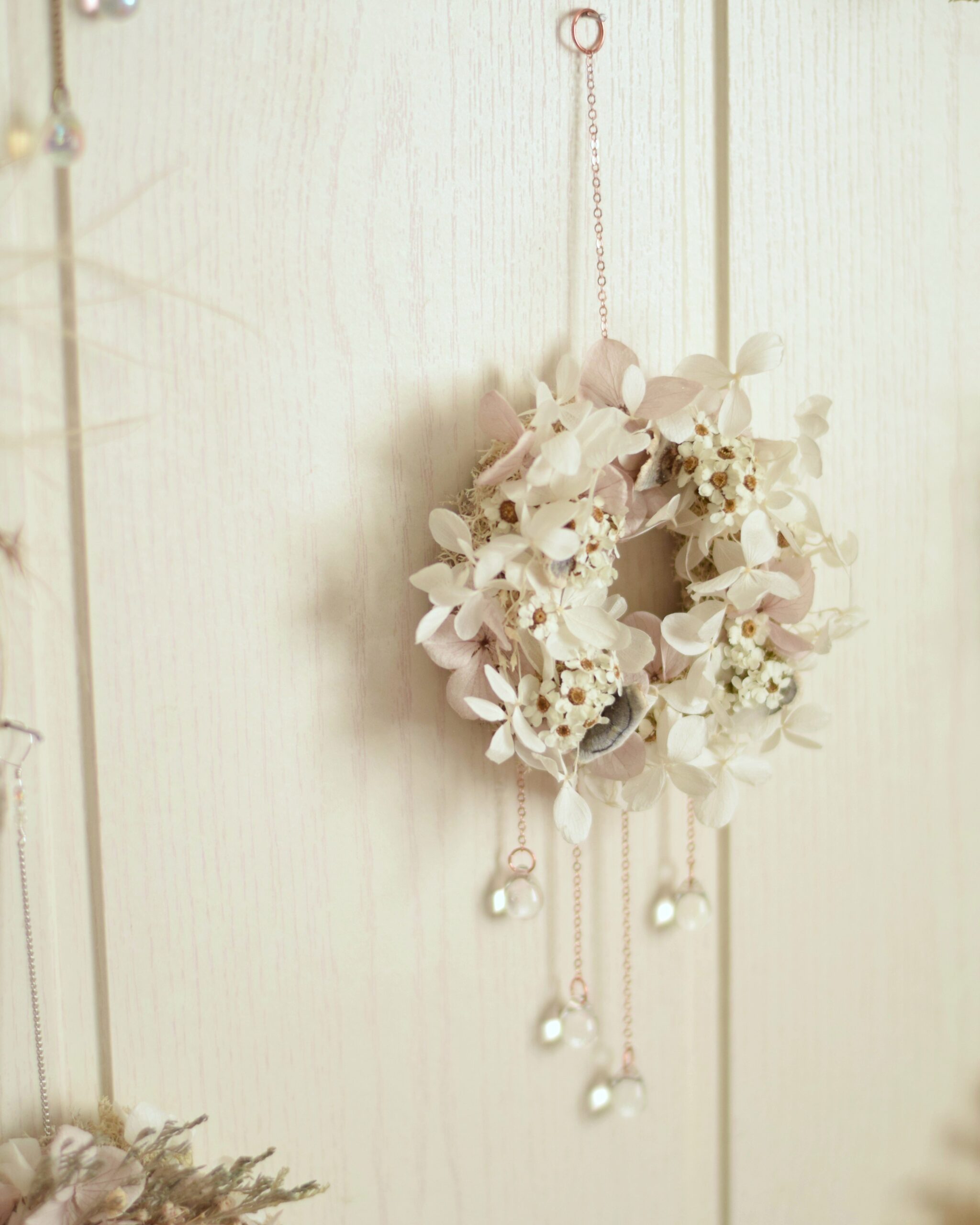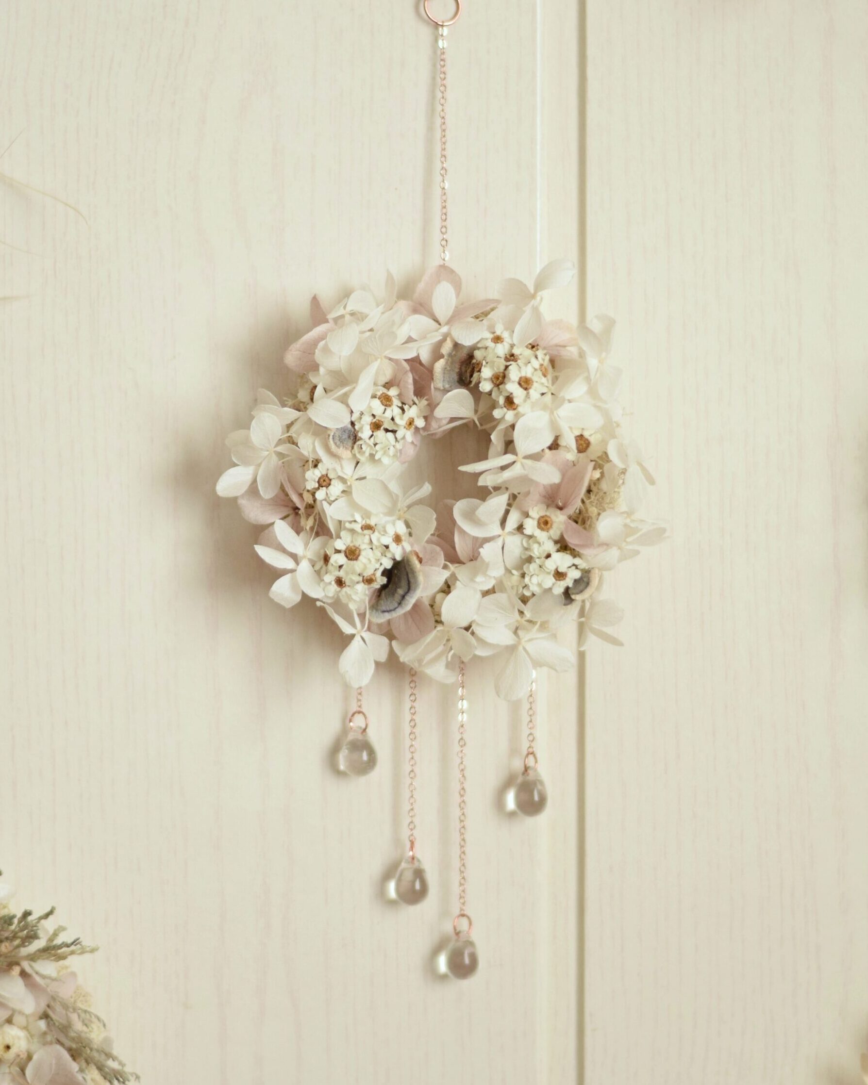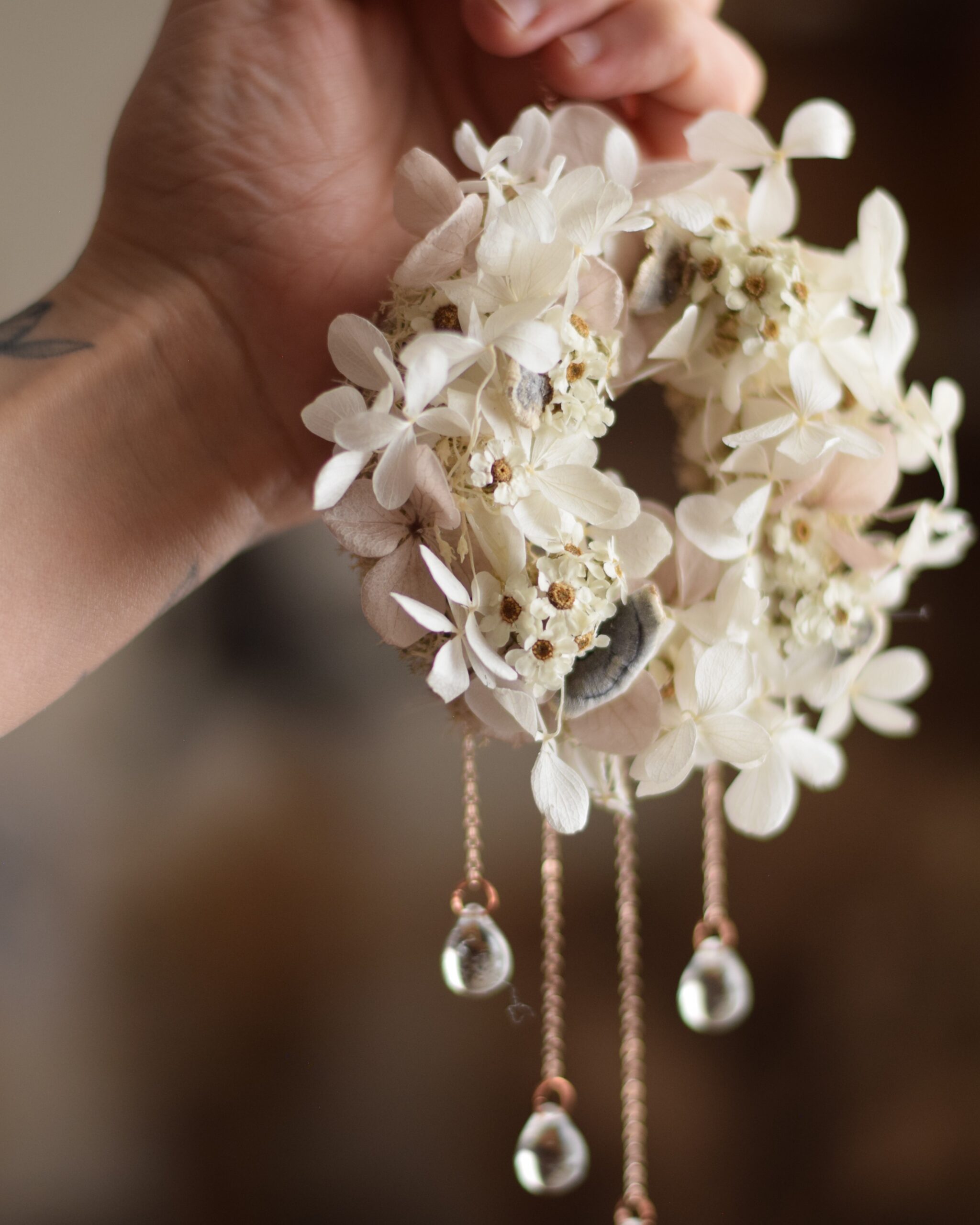 Ce Mikro est fait à partir d’un anneau de rideau en bois sur lequel j’ai collé de véritables fleurs séchées et stabilisées ainsi que quelques champignons séchés. Enfin, j’ai accroché de fines chaînes ainsi que 4 perles de verre en forme de gouttes d’eau qui font scintiller la création et font d’elle un véritable bijou de mur féérique.