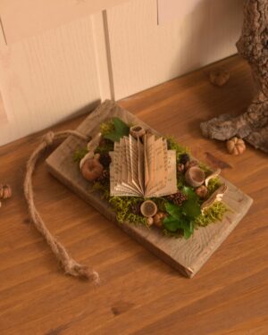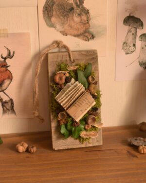 Une suspension murale originale et unique réalisée à partir d’un support en bois que j’ai chiné en ligne. Cette création féérique est parfaite pour les amoureux des livres et des univers fantastiques.