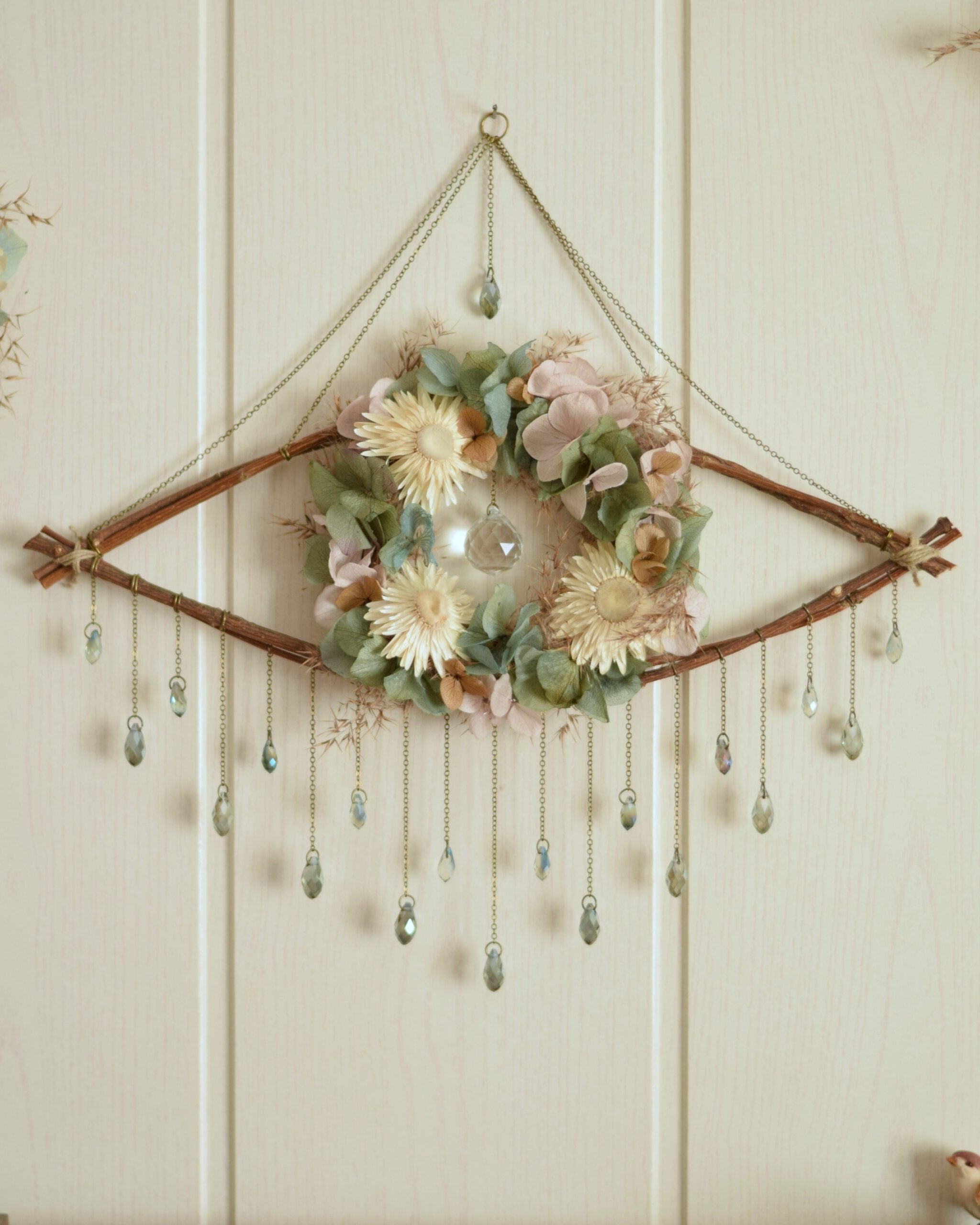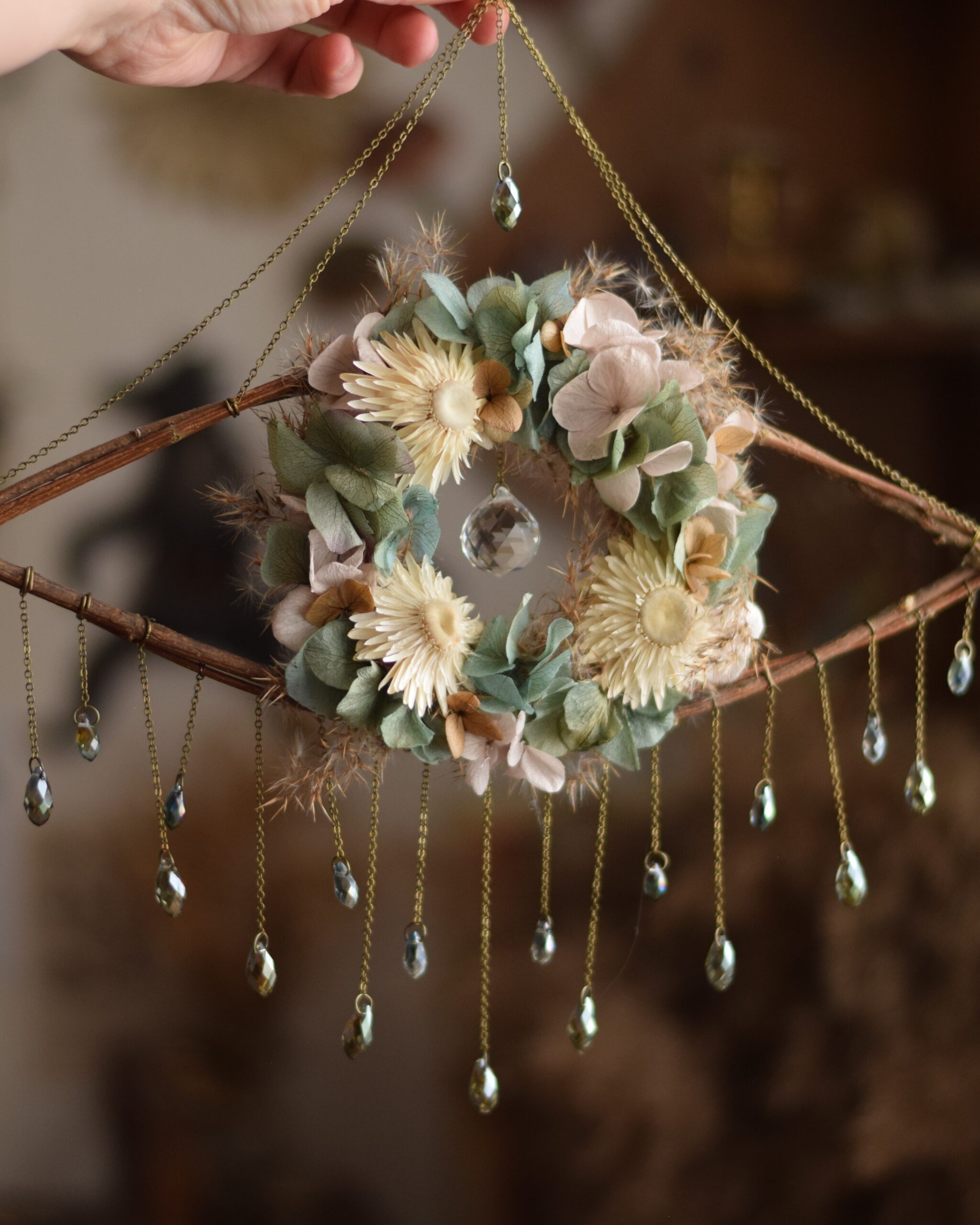 Cet oeil est formé de petites branches entrelacées et d’un dessous de verre en bois que j’ai chiné, puis transformé en minie couronne. Le tout décoré de véritables fleurs séchées et stabilisées. Une grosse perle en verre au centre lui sert de pupille.